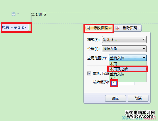 6、如下圖示,點擊“修改頁碼”,將應用范圍設置為“本頁及以后”,下面的其起始值設置為“1”,確定即可。確定后實際上WPS會自動將本頁及以后設置為新的一節,這和直接在“章節管理”中插入分節符后設置單獨頁碼效果一樣的。