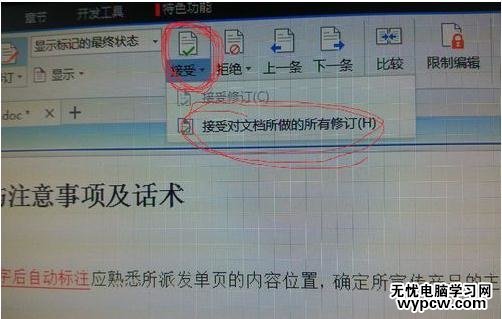 5、待文字全部編輯結(jié)束后,通過系統(tǒng)的自動(dòng)標(biāo)注,會(huì)很清晰的進(jìn)行復(fù)查,看修訂部分是否有問題,確認(rèn)沒問題的話,點(diǎn)擊展開“審閱”功能下方的“接受”功能,再點(diǎn)擊“接受”功能下的“接受對(duì)文檔所做的所有修訂(H)”;
