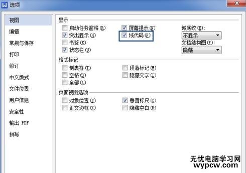 另外WPS文字中域有的有參數,有的沒有參數,像HYPERLINK,TOC,SEQ就有參數,而TIME,PAGE等就沒有參數。我們插入域后,WPS文字一般不會顯示域原來的內容。我們可以點擊WPS文字下面的工具---選項菜單,打開選項對話框,在顯示組里面勾選域代碼就可以了。