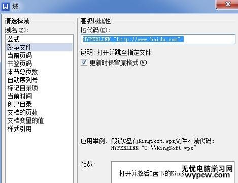 點擊插入域中跳至文件,在域代碼里面輸入 HYPERLINK "HTTP://WWW.BAIDU.COM"可以創建超鏈接。