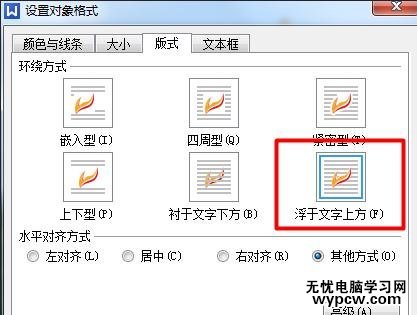 如圖所示,在設置對象格式對話框下的顏色與線條,選擇填充顏色:無填充顏色。線條顏色:無線條顏色。版式選擇浮于文字上方,單擊確定按鈕。