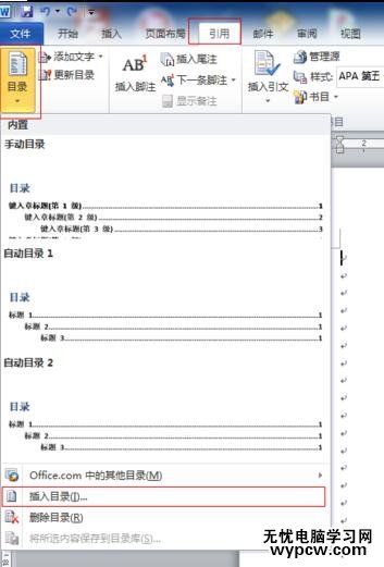 步驟三:再切換至頁面視圖,選引用--目錄--插入目錄,如圖所示