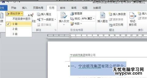 步驟二:選中第一層次的標題,然后點擊上方功能欄的引用,添加文字下拉菜單選擇1級