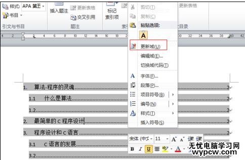 步驟九:如果添加完目錄之后,你又對文檔進行了修改,則可以再修改完成之后,再點擊上方功能菜單或直接選中整個目錄,點擊右鍵,在菜單中選中更新域-更新整個目錄