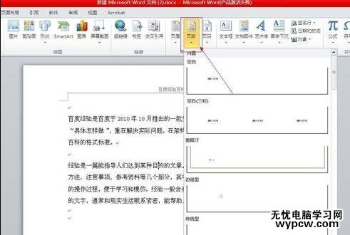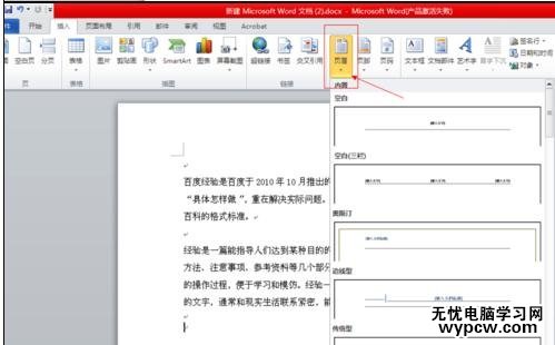 步驟一:打開我們要編輯的word文檔,點擊插入,先選擇頁眉這個選項,如下圖,可以看到有五種頁眉類型,我們可以選擇適合我們的類型。