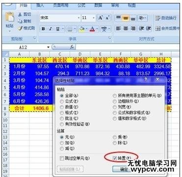 行列轉置步驟4:在這“選擇性粘貼”內找到轉置,在它前面的方框內打勾,如圖;