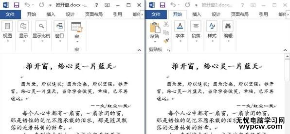 1、我們現在選中其中一個需要進行并排查看的Word窗口,切換到“視圖”選項卡,然后單擊“窗口”組中的“并排查看”按鈕。
