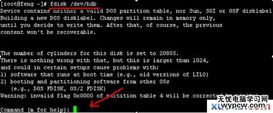 輸入 fdisk /dev/hdb 然后回車,給硬盤進行分區。如下圖