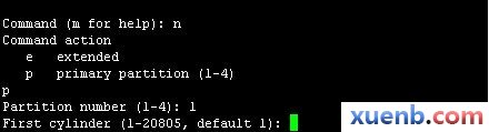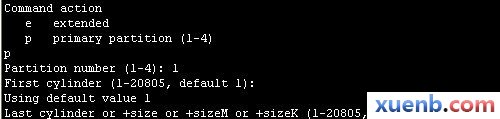 First cylinder (1-20805, default 1):這里是設置分區起始的柱面,直接回車選擇默認即可,回車后如下圖