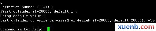 Last cylinder or +size or +sizeM or +sizeK (1-20805, default 20805):此處是設置分區結束柱面,+3G表示從起始柱面開始向后3G結束,也是是設置分區大小為3G,輸入+3G后回車,如下圖所示