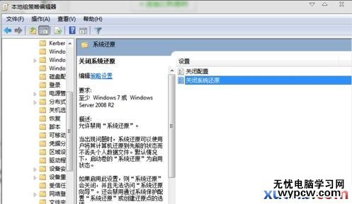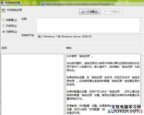 打開組策略,定位到計算機配置-管理模板-系統-系統還原中找"關閉系統還原",雙擊,設置選"已禁用",確定。