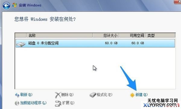 7、選擇原分區盤,點刪除,全部分區盤全部刪除后,選擇未分配空間,點新建;