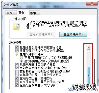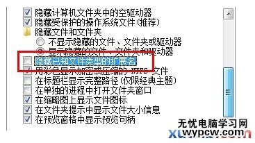 4、然后拖動進度條到最下端,找到“隱藏一直文件的擴展名”這一項, 取消勾選。
