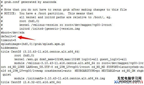 第四:如果查看/boot/grub/grub.conf,default=1,則將default=0默認(rèn)支持xen的內(nèi)核啟動(dòng)