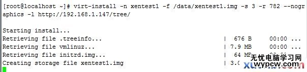 [root@localhost ~]# virt-install -nxentest -f /data/xentest.img -s 3 -r 782 --nographics -l http://192.168.1.147/tree/