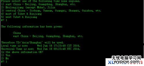 執(zhí)行tzselect命令-->選擇Asia-->選擇China-->選擇east China - Beijing, Guangdong, Shanghai, etc-->然后輸入1。過程如下圖: