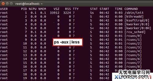 在控制臺使用ps命令“ps -aux|less”,查看當前系統正在運行的所有進程。