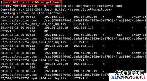 httpry隨后偵聽某個特定的網絡接口,并實時顯示捕獲的HTTP請求/回應。