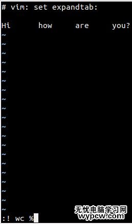 假設你在編輯一個文件,希望知道這個文件包含的行數、單詞數和字符數。為了達到這個目的,在 vim 的命令行模式下,只需要輸入冒號 :,接下來一個感嘆號 !,最后是要執行的命令(這個例子中使用的是 wc)和緊接著的文件名(使用 % 表示當前文件)。