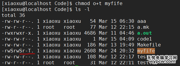 chmod o+t myfife:為其他用戶設置t權限,說明其他用戶不能對其進行刪除操作