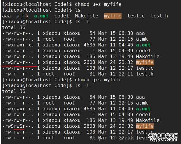 chmod u+s myfife:為用戶設置s權限,具有文件所有者的權限