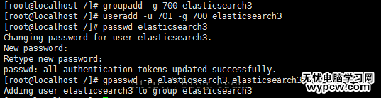 groupadd -g 700 elasticsearch3——>新建用戶組,組名叫elasticsearch3