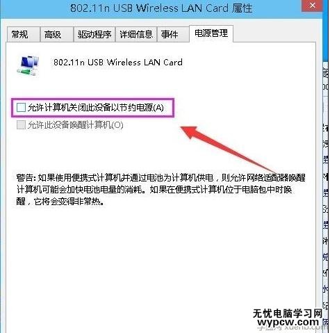 點擊【電源管理】然后把【允許計算機關閉設備節約電源】取消勾選 ,再點擊確定看看它待機了還會不會有用。