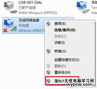 接著右擊“無線網絡”圖標,從彈出的菜單中選擇“屬性”項。