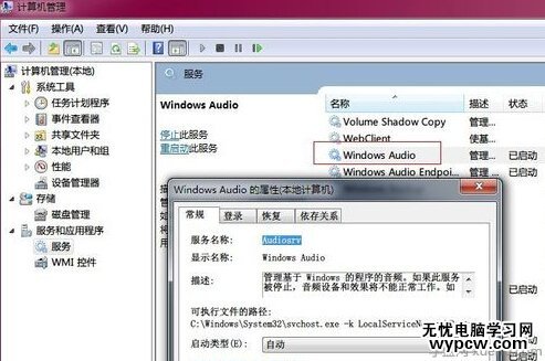 檢查Win7的聲音服務(wù)是否被禁用,右鍵單擊開(kāi)始菜單中的計(jì)算機(jī)一項(xiàng),選擇管理,進(jìn)入服務(wù)選項(xiàng)中,找到windows Audio一項(xiàng)確保其保持啟動(dòng)狀態(tài)。