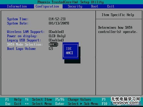 選擇configuration標簽頁,將硬盤模式修改下,在設置中將"SATA Mode Selection"設定為"AHCI"。另如果改裝xp系統:在bios設置中將"SATA Mode Selection"設定為"IDE"。如下圖所示: