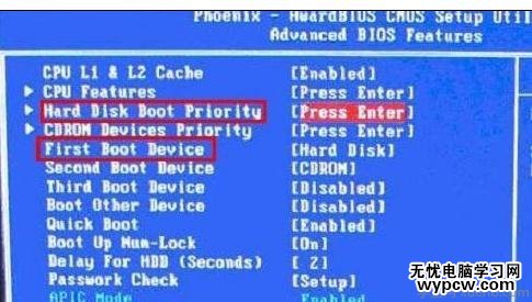 進入BIOS設置界面后,因為電腦主板的差異設置U盤啟動的選擇方法有些不同,最常見的是依次選擇(Advanced BIOS Features)→(Hard Disk Boot Priority)→選擇為你插入電腦上的U盤為優先啟動級。