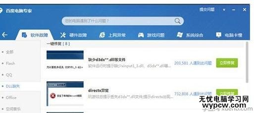 1、我們在安裝并打開百度電腦專家后,你就會看到【軟件故障】里面會有個dll缺失選項。