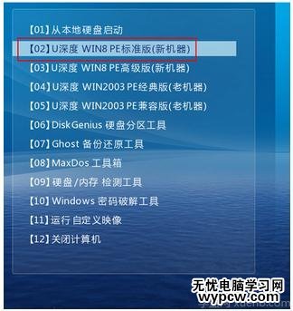 1、先將u深度u盤啟動盤連接到電腦,重啟電腦等待出現開機畫面時按下啟動快捷鍵,使用u盤啟動盤進入u深度主菜單,選擇【02】u深度Win8PE標準版(新機器),按下回車鍵進入,如圖所示: