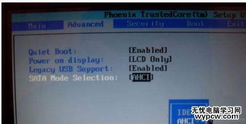 在此時的界面,我們看到要修改的SATA Mode Selection。如果現實IDE,那么我們修改成ACHI模式。