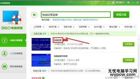 接著在打開的“360電腦救援”窗口中,輸入“電腦經(jīng)常藍屏”,并從結(jié)果中點擊“電腦藍屏(官方)”進入。