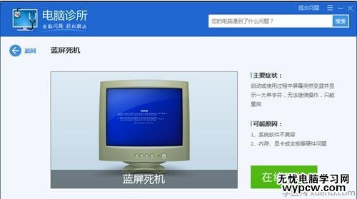 2,打開了電腦診所之后,點(diǎn)擊右上角的搜索窗口,然后在里面搜索【藍(lán)屏死機(jī)】,然后根據(jù)提示逐步進(jìn)行操作,就可以幫你順利解決問題了。
