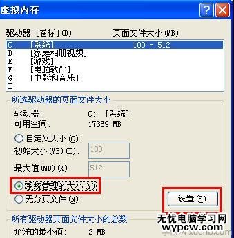 在此界面中,通過將各個盤上的虛擬內(nèi)存大小設(shè)置為“系統(tǒng)管理的大小”并點擊“設(shè)置”按鈕。設(shè)置完成后,點擊“確定”按鈕。最后重啟一下電腦讓設(shè)置生效。