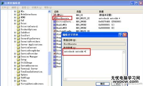 依次展開“HKEY_LOCAL_macHINE ”→“SYSTEM ”→“CurrentControlSet ”→“Control ”→“SessionManager ”,在右側(cè)找到BootExecute項,雙擊將其值設置為“ autocheck autochk *”。 經(jīng)過這樣設置以后,如果電腦出現(xiàn)藍屏,將會在電腦重啟后自動運行自檢程序,試圖對系統(tǒng)中存在的錯誤進行修復。
