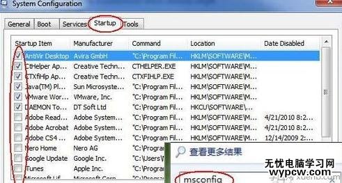 在安全模式下禁用多余啟動項看看。在“運行”對話框中輸入“msconfig”,在打開的窗口中切換到“啟動”選項卡中,取消所有多余啟動項:
