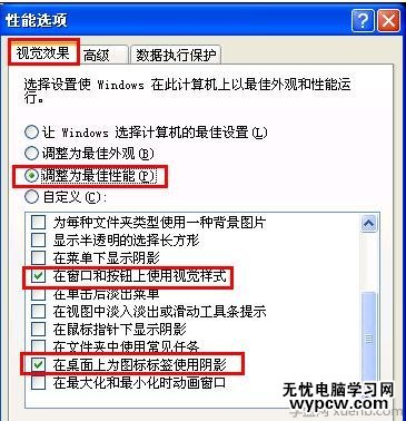 在打開的“性能選項”窗口中,切換至“視覺效果”選項卡,勾選“調整為最佳性能”,同時為了視覺上的友好,可適當勾選部分選項。