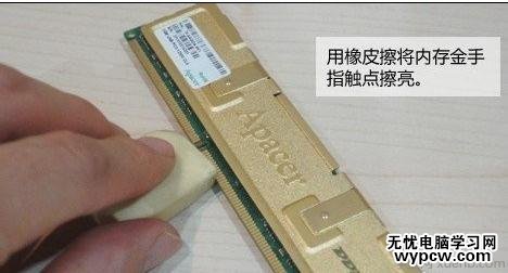 拔出內存條(內存條認識吧,請參照第一副圖片),用橡皮擦拭(有銹跡可以用細細的砂紙輕輕打磨)