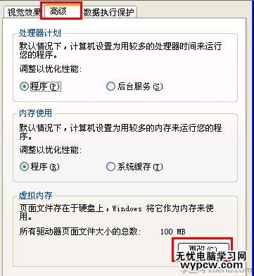 切換至“高級(jí)”選項(xiàng)卡,點(diǎn)擊“虛擬內(nèi)存 更改”按鈕。