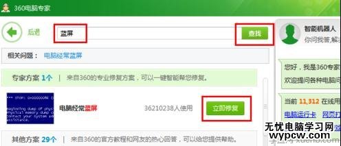 打開360電腦專家,輸入問題“藍屏”并點擊“搜索”按鈕,然后在搜索結果頁面中點擊“電腦經常藍屏 立即修復”按鈕。