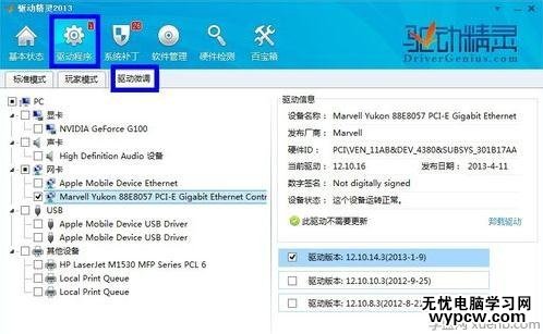 更新筆記本無線網卡驅動之二:使用第三方軟件幫助安裝驅動。這里以驅動精靈2013為例,可以官網免費下載。打開以后先點擊“驅動程序”按鈕,然后再點擊“驅動微調”選項,如圖所示