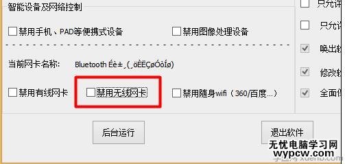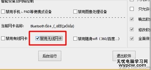 此時就會打開程序主界面,在此界面中,找到“禁用無線網卡”,勾選“禁用無線網卡”項。如圖: