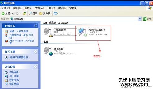 當安裝完驅動精靈提供的無線網卡后,假如還不能搜索到無線網絡,那么就應該調整系統的某些設置,打開網上鄰居——》查看網絡連接——>雙擊無線網絡連接