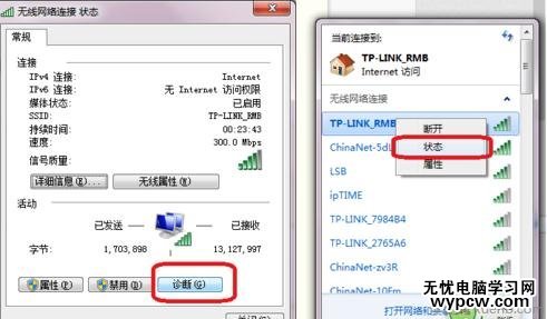 在出現的目前連接的網絡名上點擊右鍵,然后選擇“狀態”。