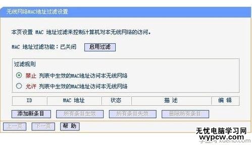 無線設置中還有一項“無線mac地址過濾”選項,可以通過MAC地址過濾來控制計算機對本無線網絡的訪問,默認的過濾規則是禁止,也就是說凡是添加到這里的MAC地址都不能訪問無線網絡,而允許則正好相反,只有添加到這里的條目才能訪問無線網絡,雖然一般使用者不會對其進行設置,為了以防萬一還是看看的好。