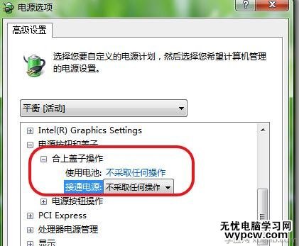 在打開頁面中,點擊電源按鈕和蓋子,合上蓋子操作一欄,全部選擇不采取任何操作,點擊確定即可