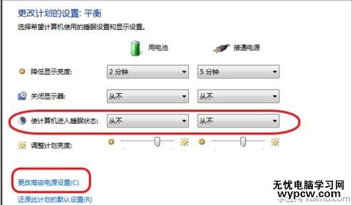 在打開頁面中,使計算機進入睡眠狀態一欄,全部選擇從不,然后點擊下方的更改高級電源設置